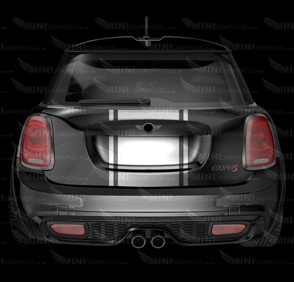 3 Stripe viper boot decal. The design shows the cars colour as the background. The image shows white vinyl on a black MINI.