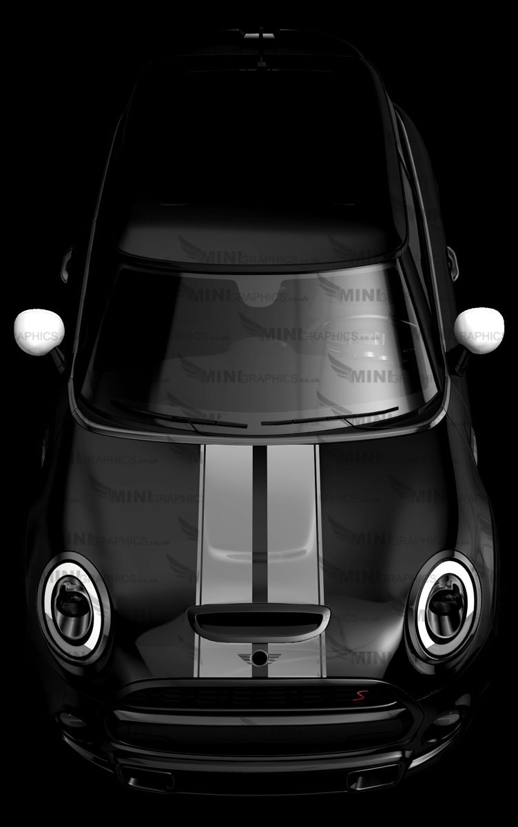 A 4 stripe viper pattern cut from vinyl. The design shows the cars colour as the background. The image shows Silver vinyl on a Black MINI.