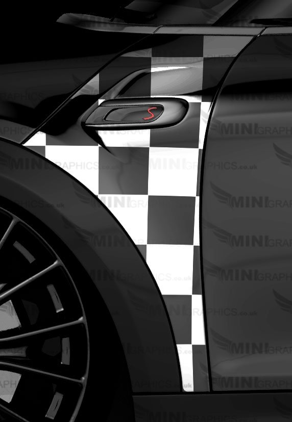 Checked-02 A-Panel Graphics pattern. The design shows the cars colour as the background. The image shows WHITE vinyl on a black MINI.