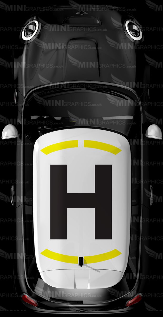 Heli-pad mini roof graphic. The design shows the cars colour as the background. The image shows yellow and black vinyl on a white roof.
