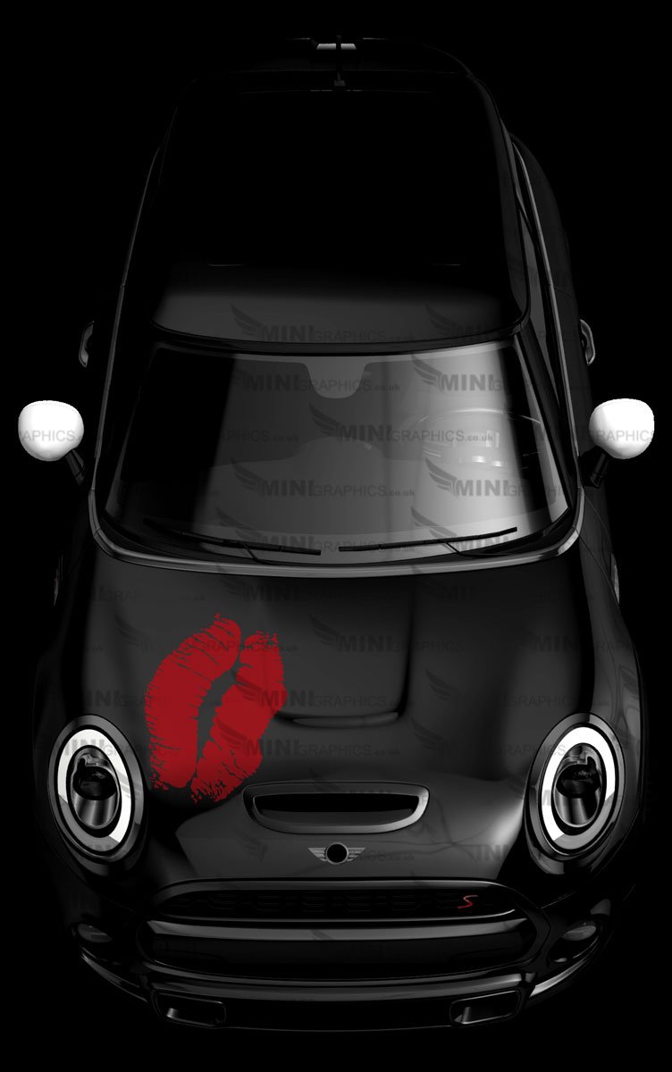 Kiss Bonnet graphic cut from vinyl. The design shows the cars colour as the background. The image shows red vinyl on a Black MINI.