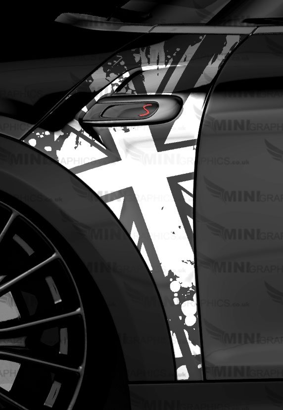 Union Jack Grunge pattern. The design shows the cars colour as the background. The image shows WHITE vinyl on a black MINI.