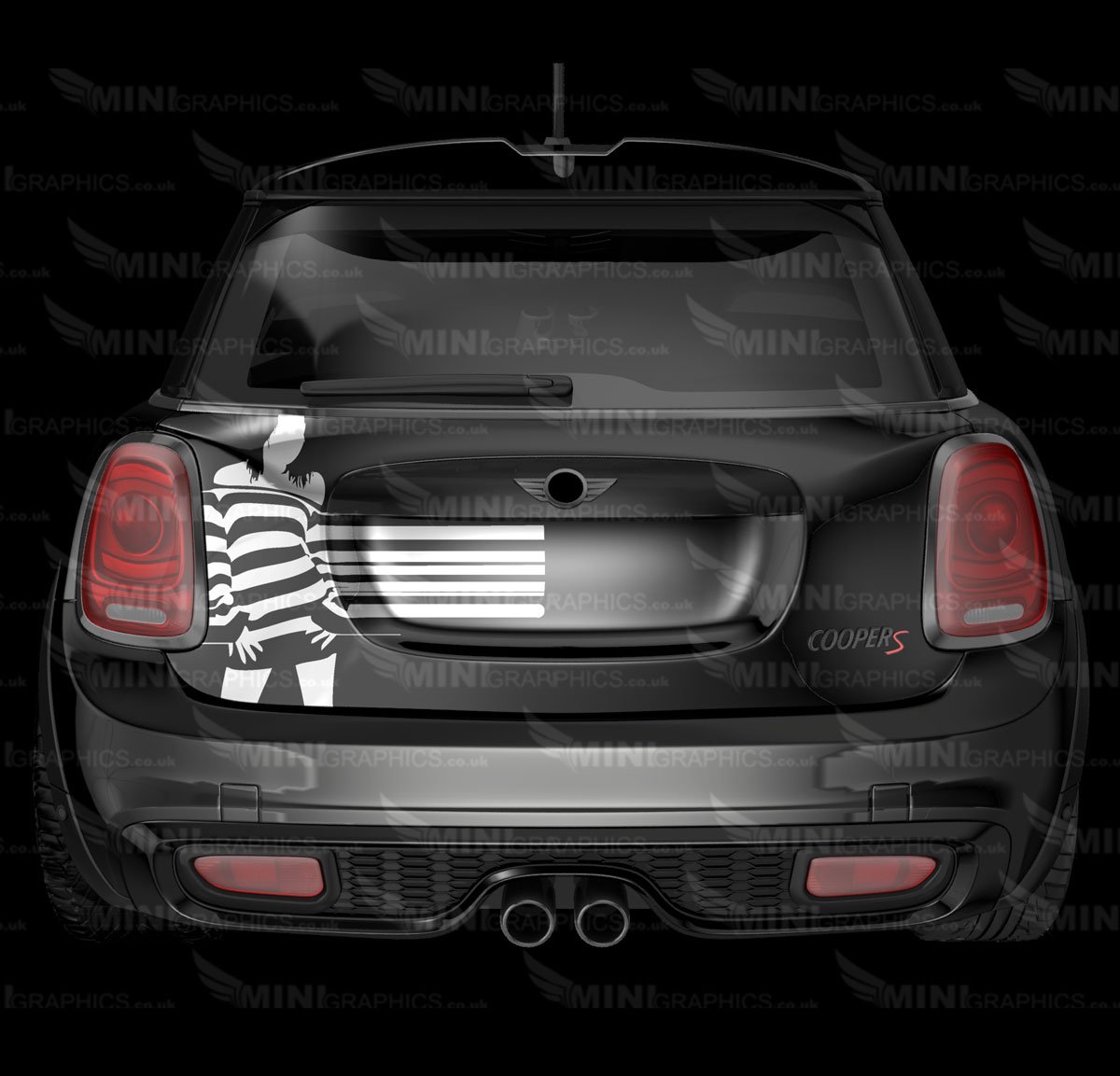 Woman in stripes boot graphic. The design shows the cars colour as the background. The image shows white vinyl on a black MINI.